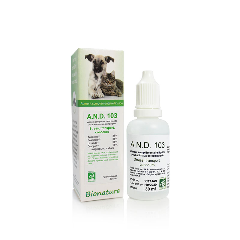 AND 103 (Apport Nutritionnel Dynamisé) est composé d’extraits de plantes traditionnellement connues pour équilibrer le système nerveux. Cette formule douce préserve la vitalité de l’animal.