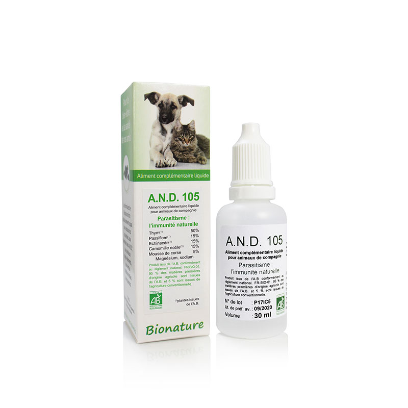 AND 105 (Apport Nutritionnel Dynamisé) est composé d’extraits de varech vermifuge (rhodomélacée), appelé plus communément mousse de Corse. Cette algue est efficace et a l’avantage de ne pas perturber la flore intestinale de l’animal. AND 105 permet d’éviter l’abus de vermicides chimiques qui détruisent l’immunité des animaux comme l’a démontré l’Institut de l’Elevage.