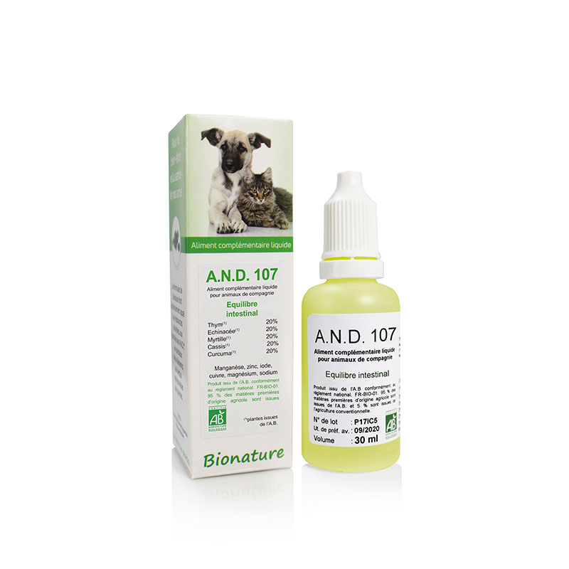 AND 107 (Apport Nutritionnel Dynamisé) atténue le surmenage intestinal face à un changement de régime habituel. Il renforce le mécanisme de défense en présence de virus intestinaux et prévient l’indigestion provenant d’aliments avariés. Il ralentit l’écoulement sans stopper l’élimination par les voies naturelles et réduit le risque de déshydratation.
