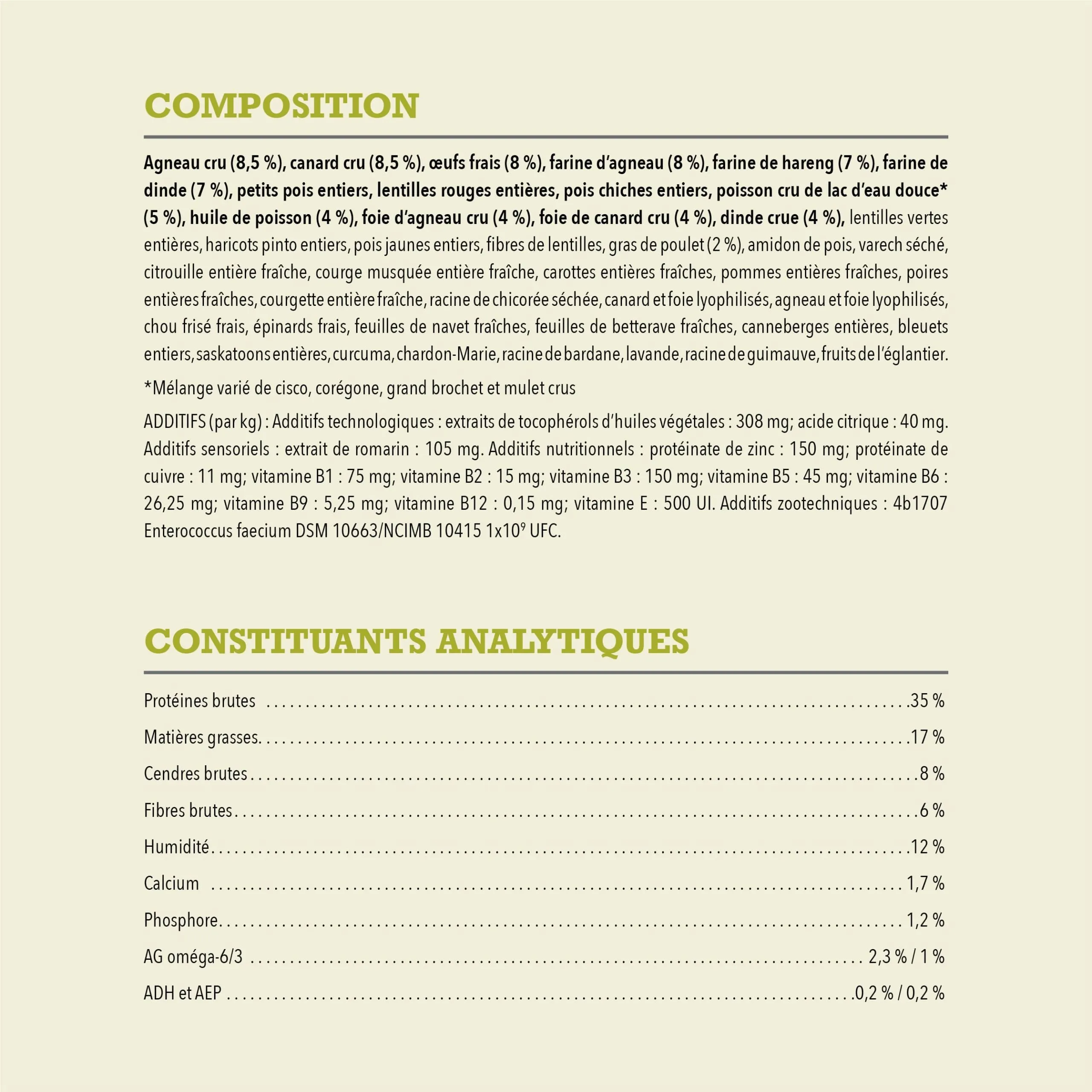 Nourriture pour chien adulte toutes races contenant 60% d’agneau, canard, oeufs et poisson ainsi que 40% de fruits et légumes
