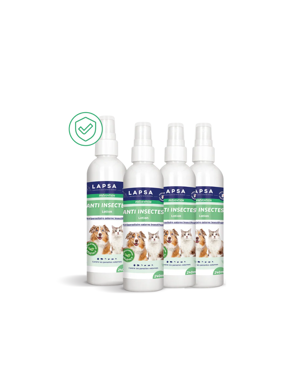 Le lot de quatre lotions sprays insectifuges aux 3 actifs d’origine végétale, protège efficacement les chiens et les chats en repoussant les parasites : puces, poux, tiques, aoûtats, phlébotomes et moustiques. Utilisation régulière à titre préventif et/ou curatif.