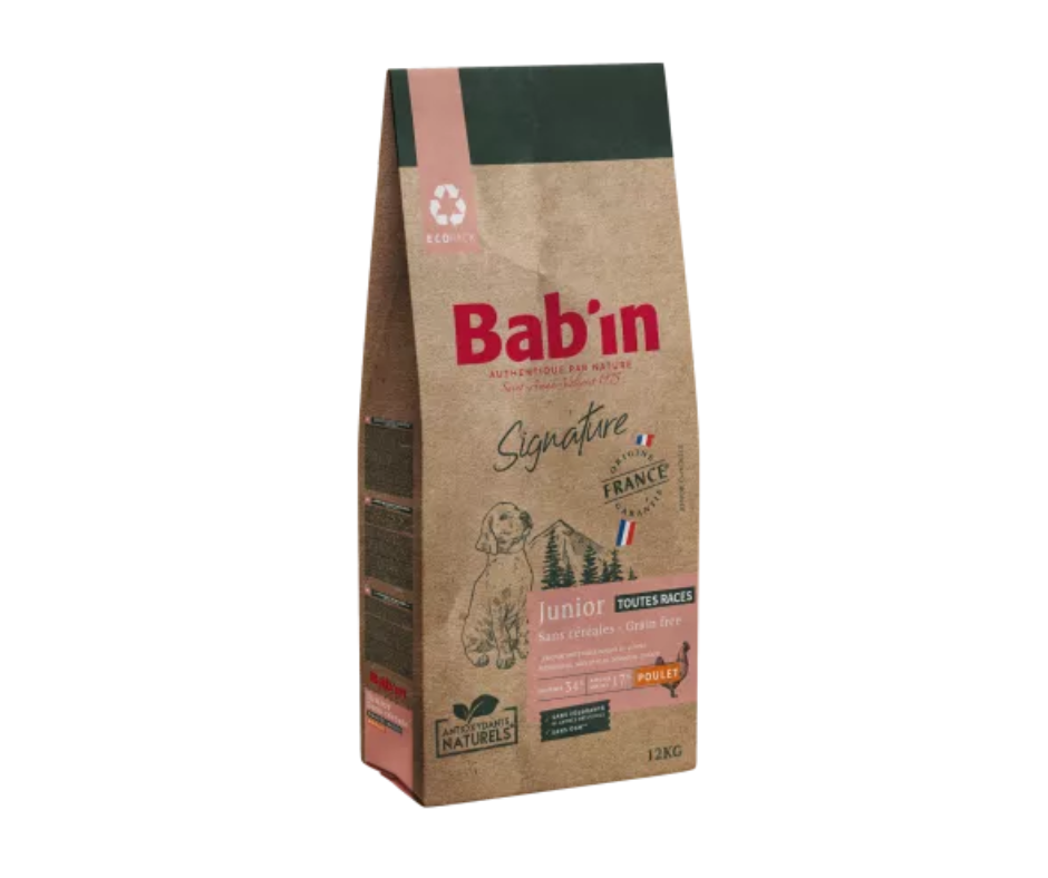 BAB’IN SANS CÉRÉALES JUNIOR, riche en poulet, répond aux besoins des chiots intolérants aux céréales et au gluten. Son taux élevé de protéines d’origine animale de haute qualité (73%, poulet, truite et œuf), combiné à des sources alternatives de glucides (pomme de terre et légumineuses) et associé à un complexe de prébiotiques (FOS & MOS) contribue à la sécurité digestive. Il assure une croissance harmonieuse avec un apport énergétique et minéral contrôlé. Il favorise également le soutien articulaire grâce au complexe de glucosamine et chondroïtine.