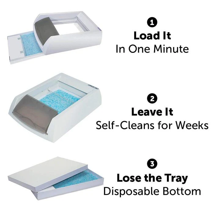 - 3 étapes faciles: mettre la recharge, laisser se nettoyer seul pendant des semaines et ensuite jeter le bac de recharge.