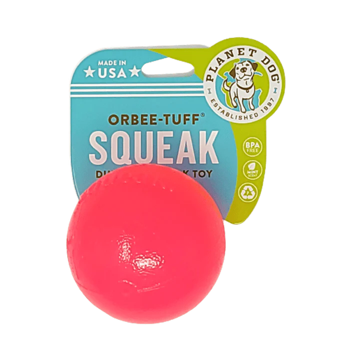 Faites la connaissance de Squeak, le membre le plus grincheux de la famille Orbee-Tuff®. Tout aussi durable que l’original, mais maintenant avec un son amusant, votre chien est sûr d’aimer. Squeak présente un système unique de couinement en attente de brevet, qui ne contient ni adhésif, ni colle, ce qui le rend 100% non toxique.