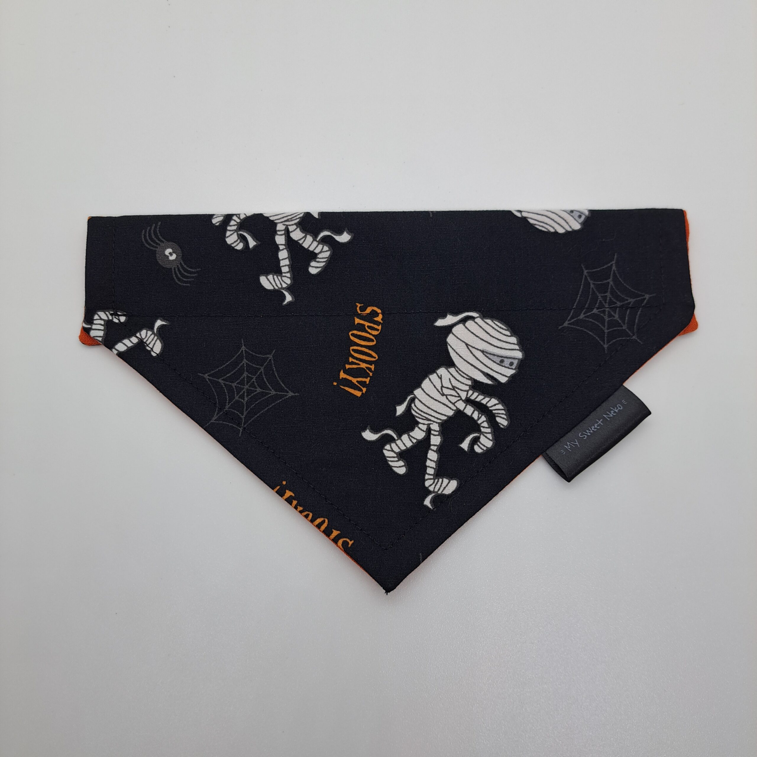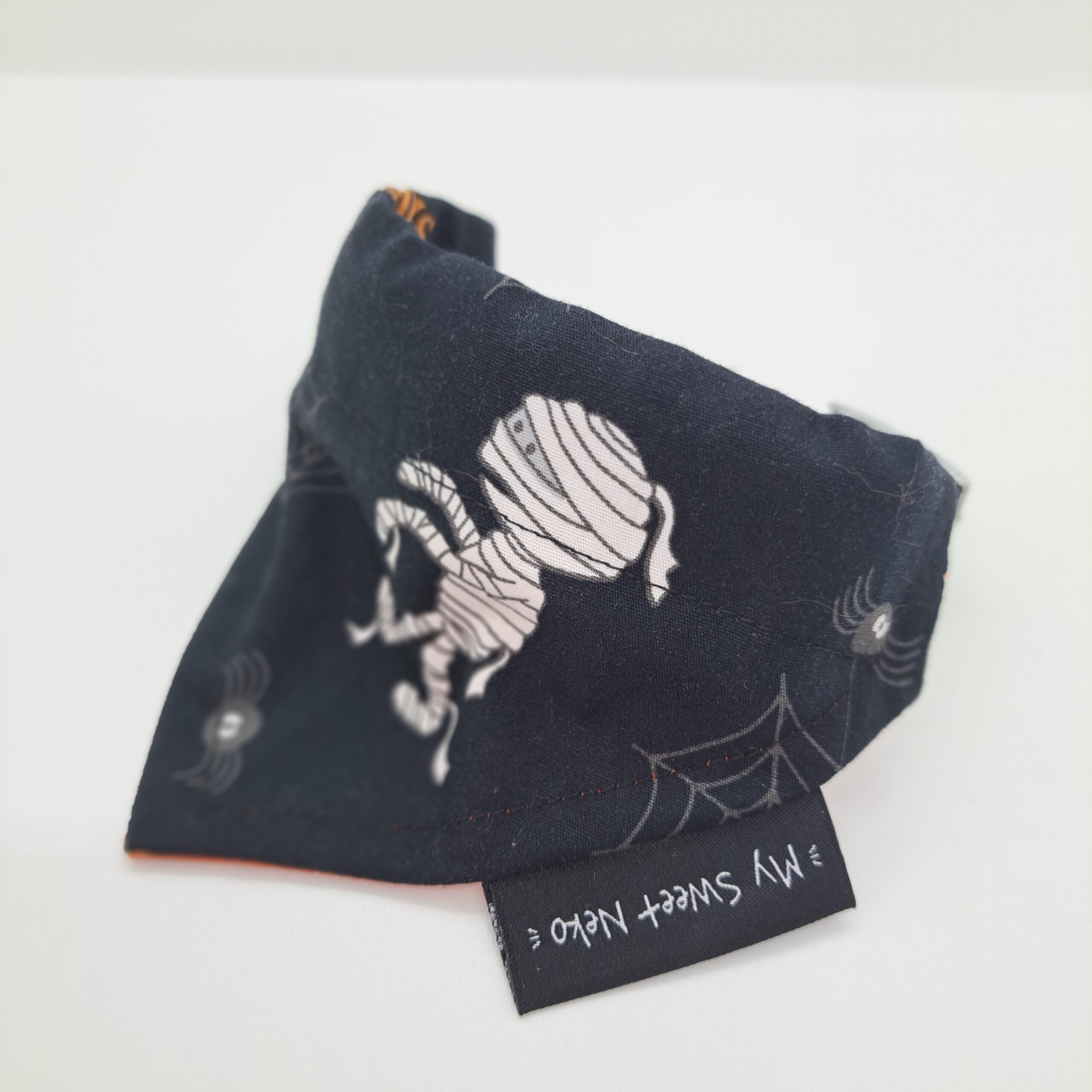 - Design : Bandana d’Halloween orné de motifs de momies mystérieuses et d’araignées effrayantes sur un fond noir classique. C’est l’accessoire idéal pour accompagner votre animal de compagnie lors des festivités d’Halloween.