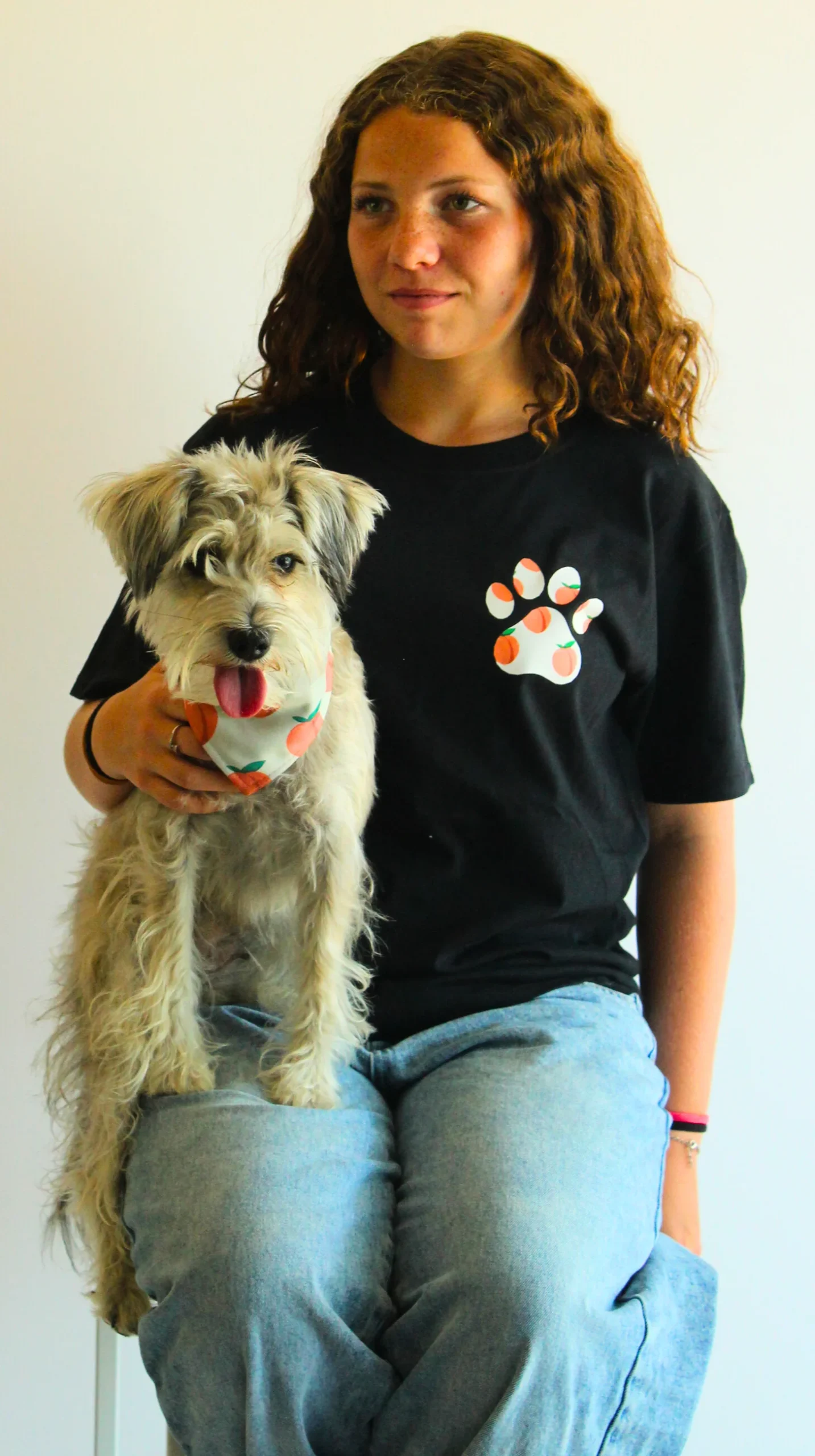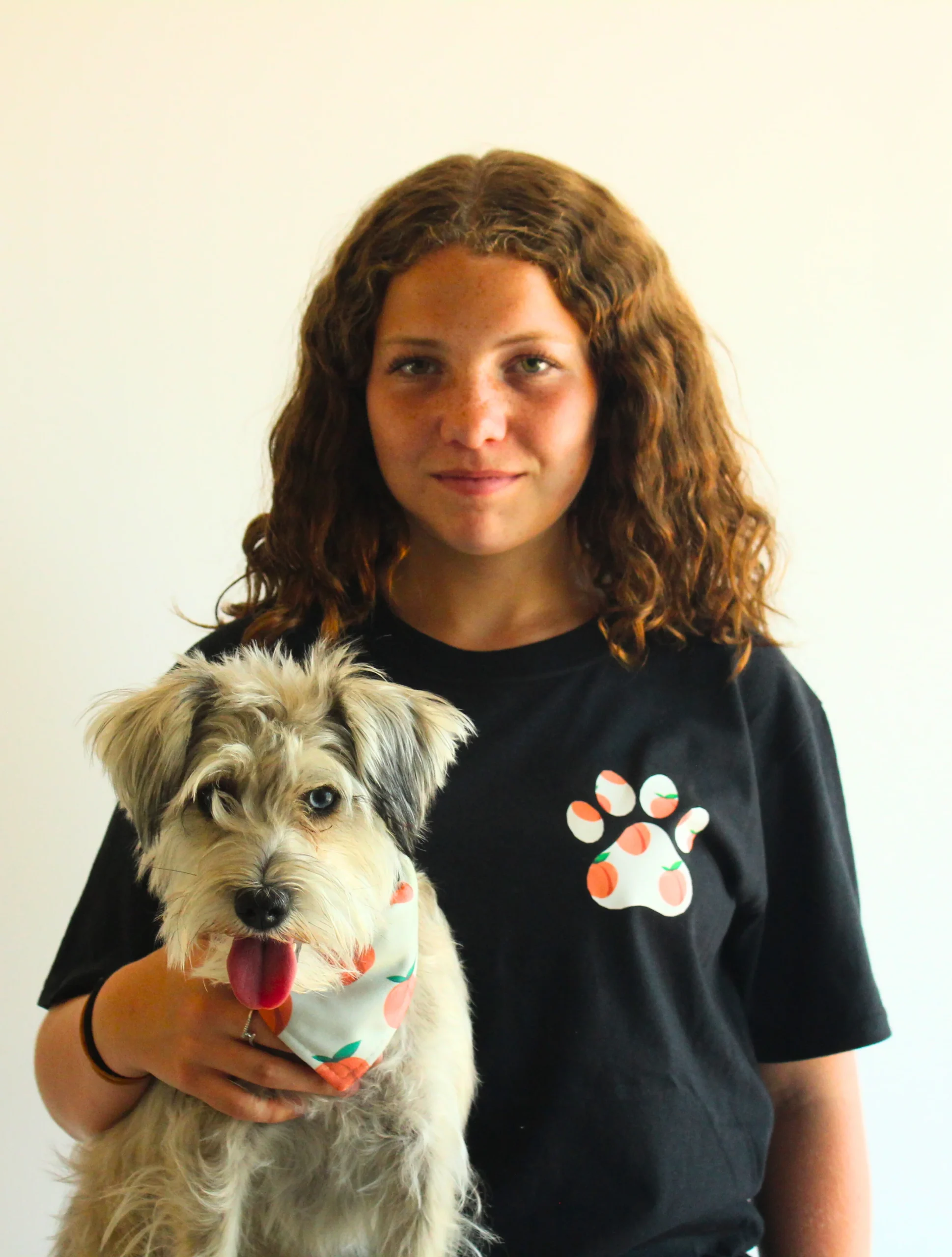 Ce bandana pour animaux arbore notre imprimé exclusif Pêches : sur un fond blanc, une empreinte de patte se remplit de pêches juteuses aux tons doux et estivaux.