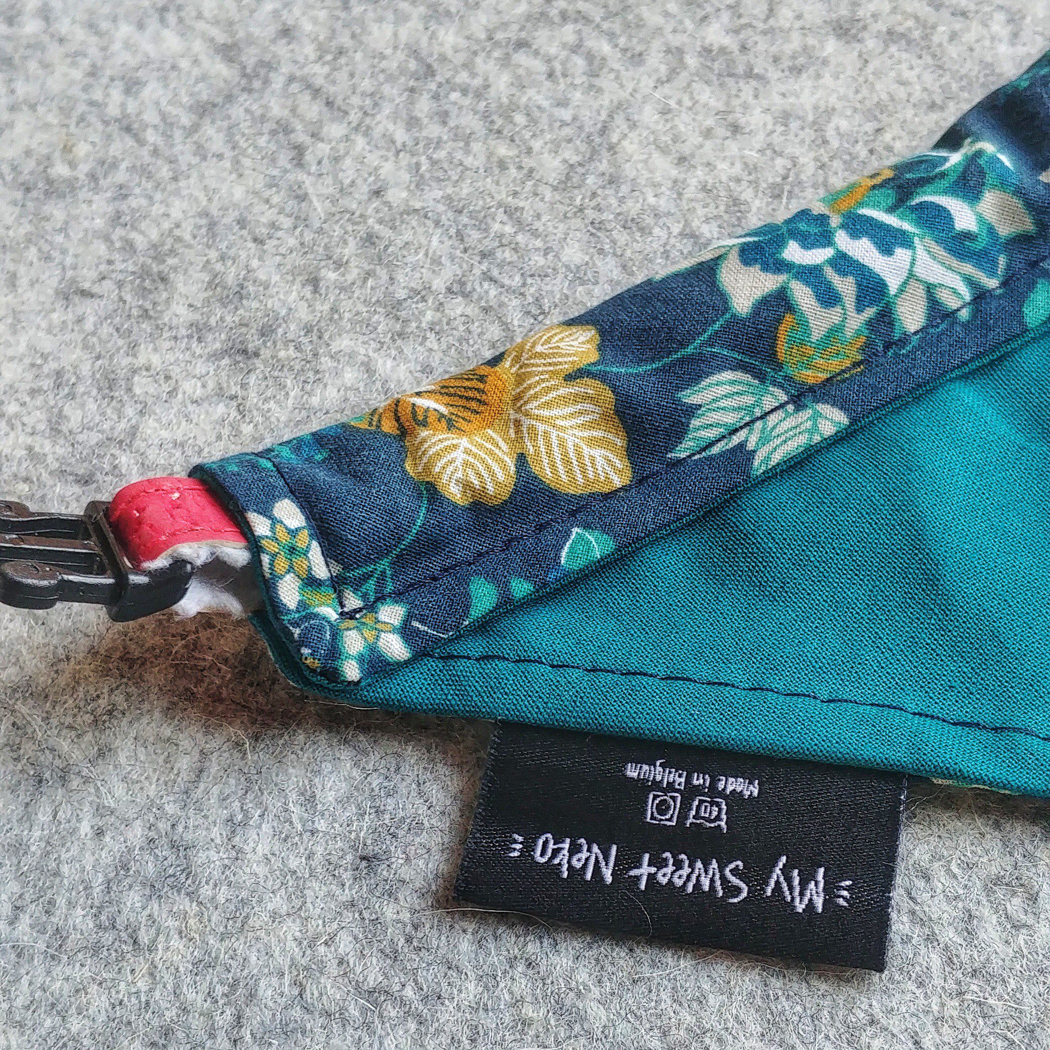 - Tissu extérieur imprimé 100% coton moutarde, turquoise, blanc et bleu