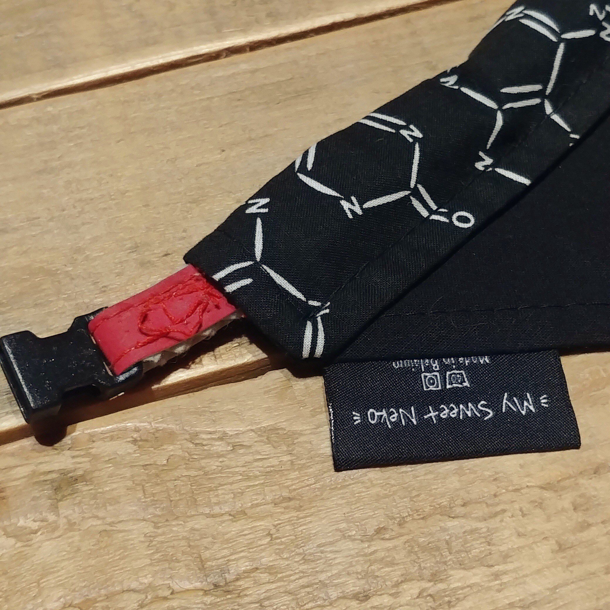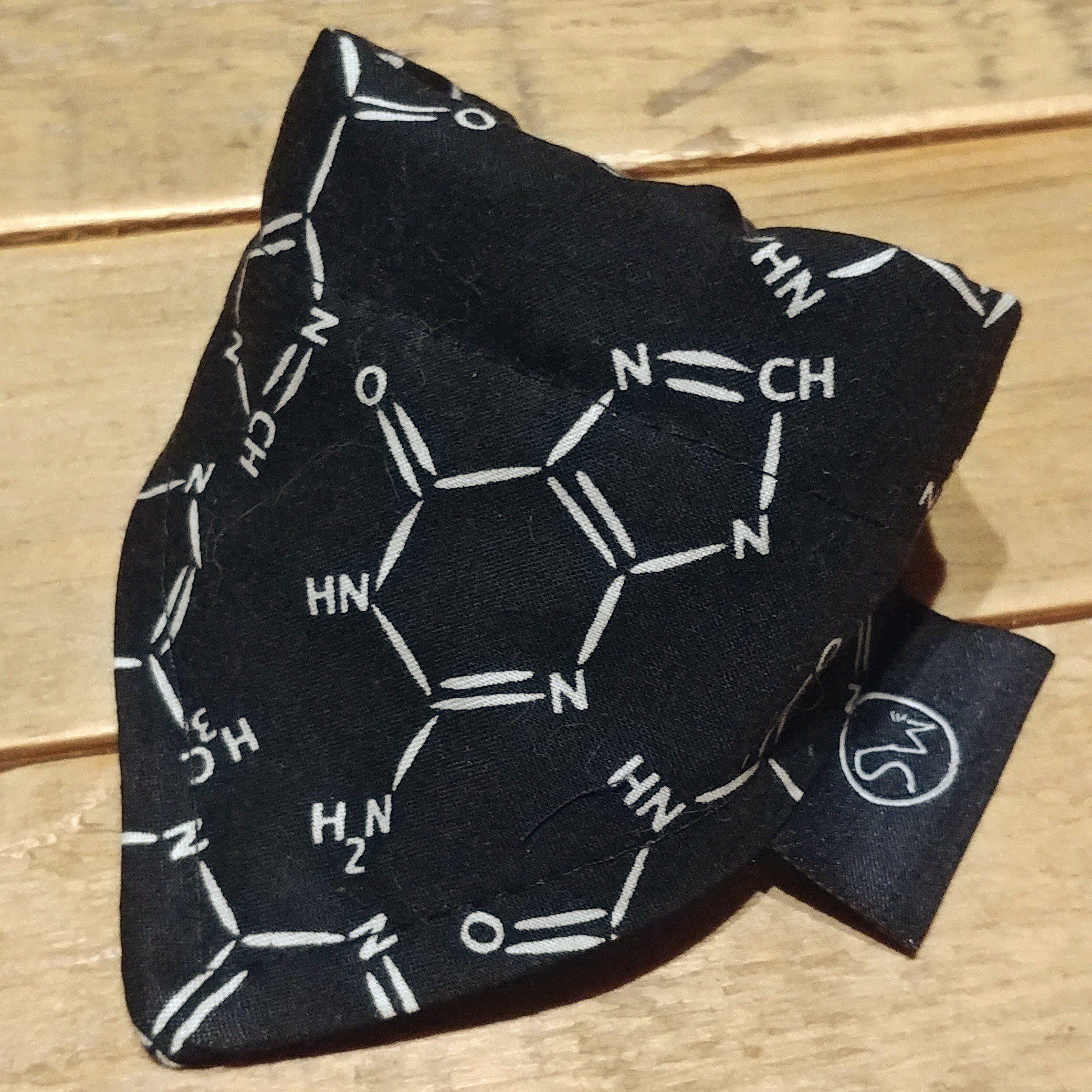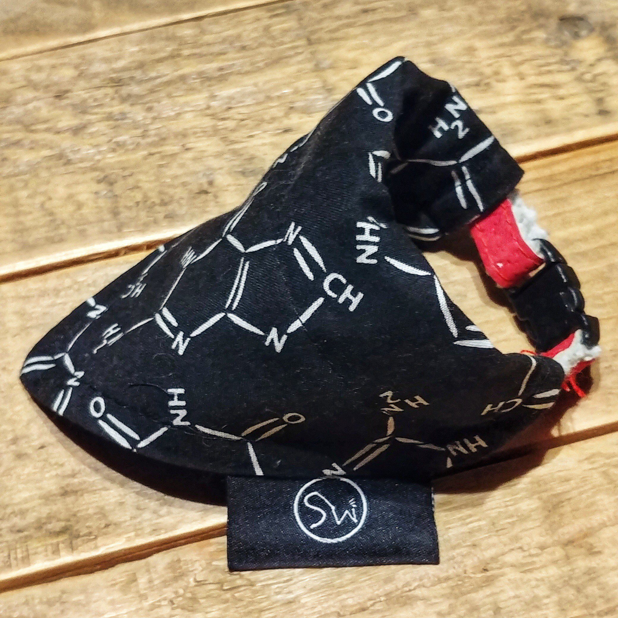 Give your cat a little scientist look with this black bandana printed with molecules!