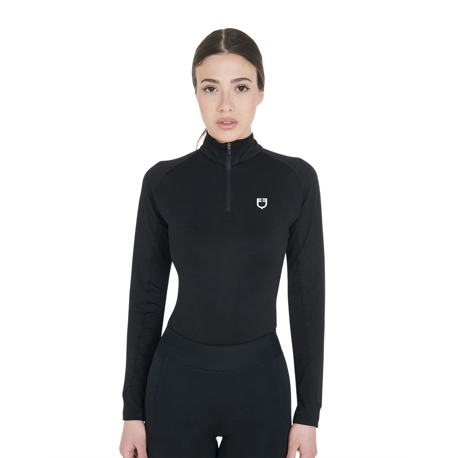 Le vêtement est agrémenté d’une fermeture zippée coupe-vent et du logo Equestro sur la poitrine gauche.