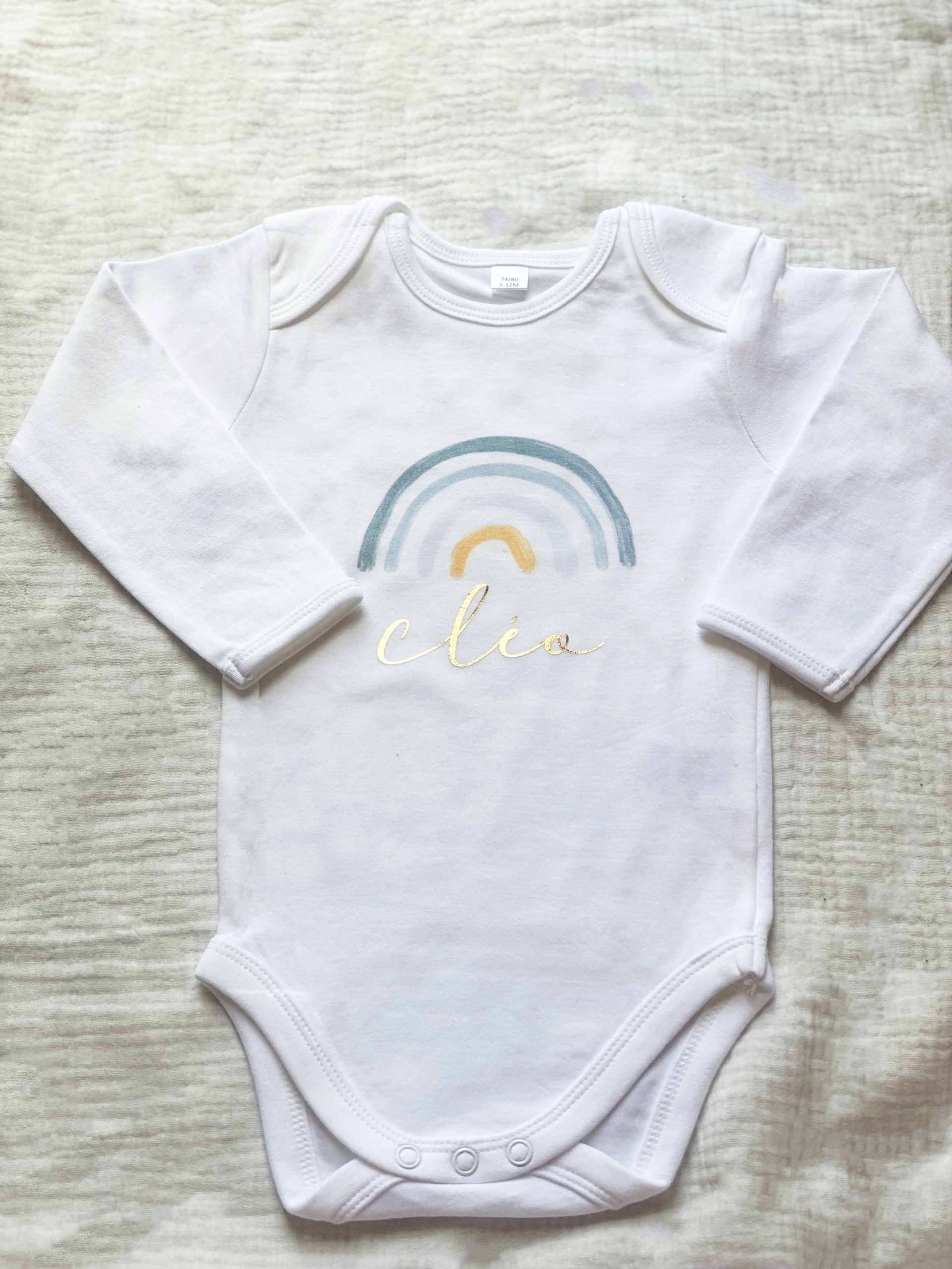 - Personnalisation adorable : Faites inscrire le prénom de votre bébé sous un charmant arc-en-ciel pastel, pour un body unique et poétique.