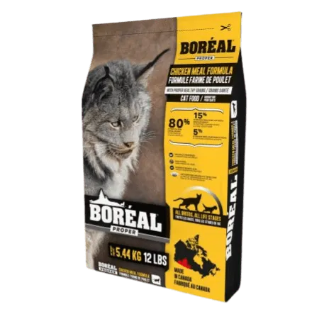 Notre nourriture pour chat Boréal Proper Farine de poulet est une nourriture sans céréale utilisant le poulet comme une nouvelle source de protéine unique.