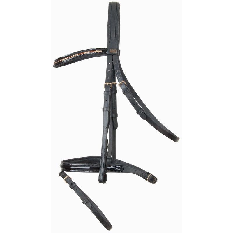 Les montants de mors de filet ont des attaches à crochets pour plus de sobriété et d’élégance. Le frontal orné de strass bicolore ton sur ton, et la muserolle en cuir vernis apportent une note d’élégance à ce bridon technique.