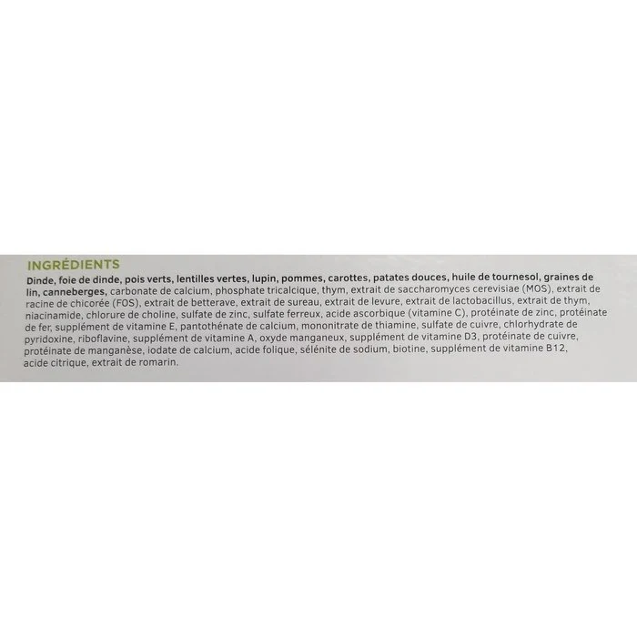 Dinde, foie de dinde, pois verts, lentilles vertes, lupin, pommes, carottes, patates douces, huile de tournesol, graines de lin, canneberges, carbonate de calcium, phosphate tricalcique, thym, extrait de saccharomyces cerevisiae (MOS), extrait de racine de chicorée (FOS), extrait de betterave, extrait de sureau, extrait de levure, extrait de lactobacillus, extrait de thym, niacinamide, chlorure de choline, sulfate de zinc, sulfate ferreux, acide ascorbique (vitamine C), protéinate de zinc, protéinate de fer, supplément de vitamine E, pantothénate de calcium, mononitrate de thiamine, sulfate de cuivre, chlorhydrate de pyridoxine, riboflavine, supplément de vitamine A, oxyde manganeux, supplément de vitamine D3, protéinate de cuivre, protéinate de manganèse, iodate de calcium, acide folique, sélénite de sodium, biotine, supplément de vitamine B12, acide citrique, extrait de romarin.