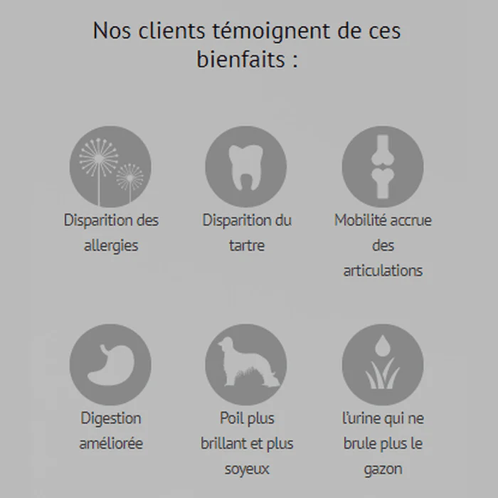 C’est le témoignage que nous recevons de nos clients. Les signes typiques d’allergies sont les otites à répétition, les plaques rouges sur la peau, le chien qui se mange les pattes, la perte excessive de poil et les trous sans poils dans le pelage du chien. Comme 100 % de nos ingrédients sont frais et acceptés pour la consommation humaine, ils sont libres de toxines et aident le chien à rétablir sa santé.