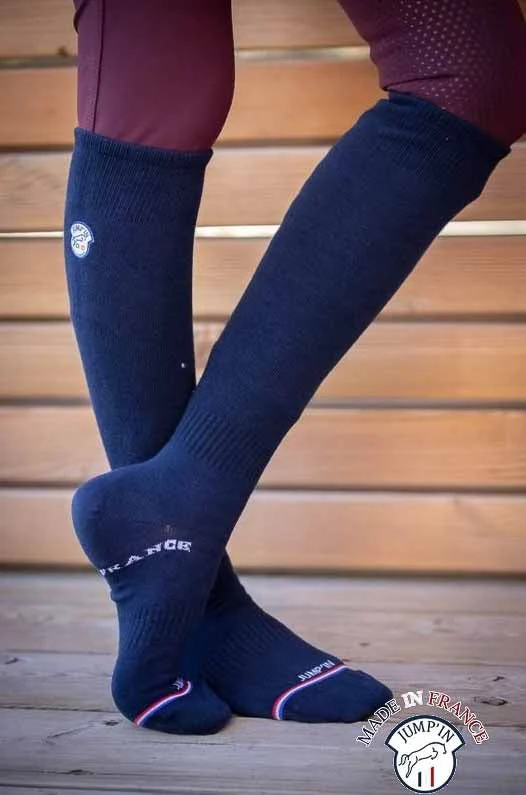 Chaussettes hautes spécifiquement faites pour la pratique de l’équitation de loisir ou de compétition. Elles sont particulièrement confortables et elles bénéficient d’un excellent maintien grâce aux bandes élastiquées en haut de la chaussette ainsi qu’à la cheville et au pied. Le petit écusson Jump’In est cousu sur la chaussette droite et vous retrouverez le petit liseré bleu blanc rouge sur le pied.