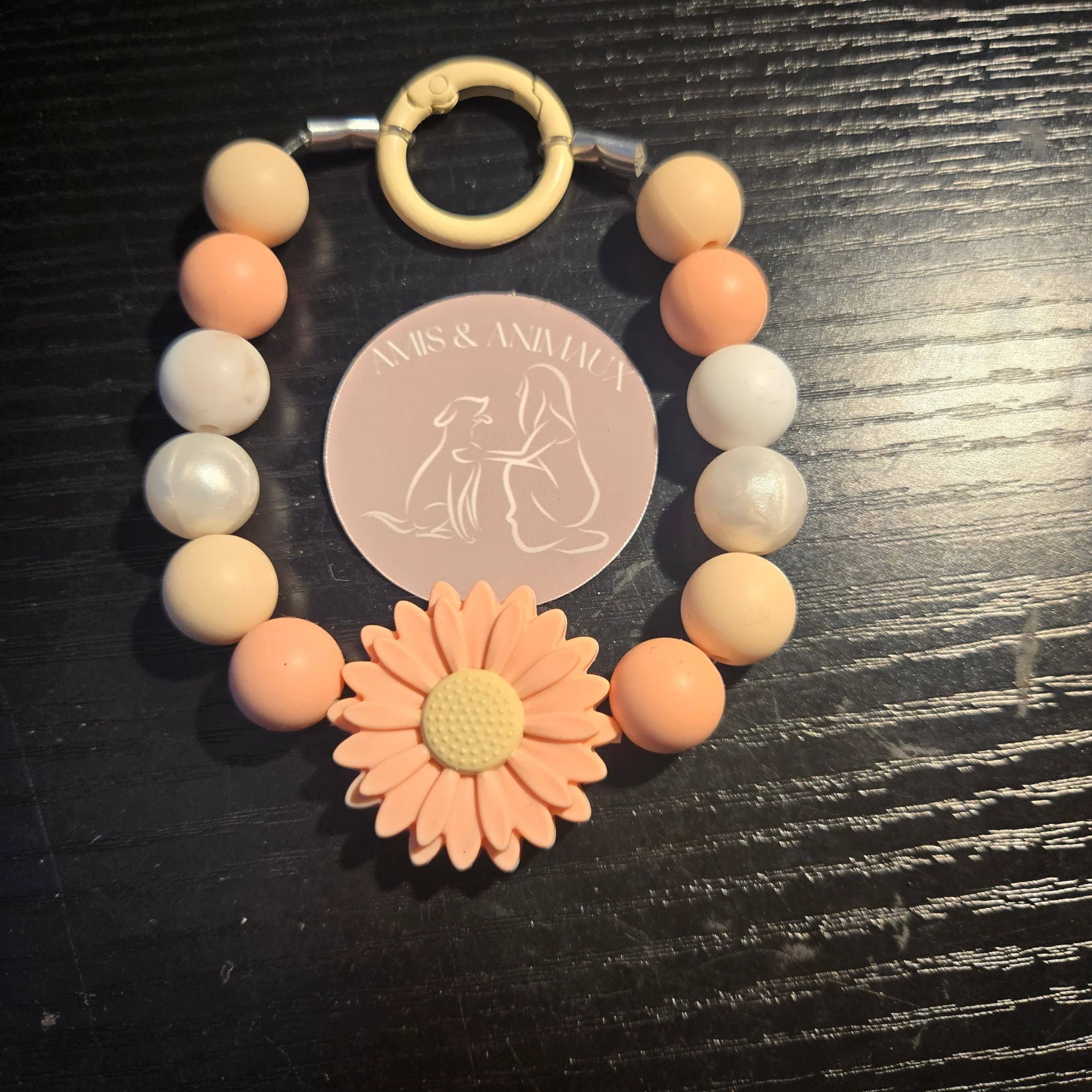 Composé de perles de silicone dans les tons beige, rose pâle et blanc, il est sublimé d’une fleur rose pâle au centre, ajoutant une touche florale toute en subtilité.