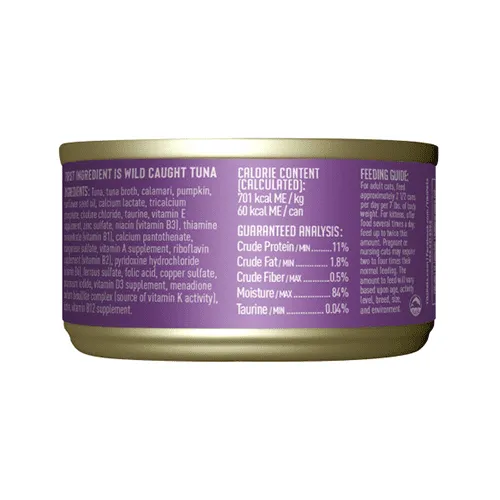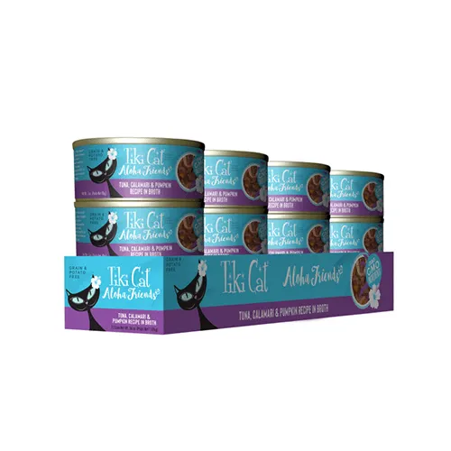 Dans les conserves pour chat Tiki Car ALoha Friends au thon, calamar et potiron, le thon sauvage est le 1er ingrédient. La citrouille offre une source douce de fibres.