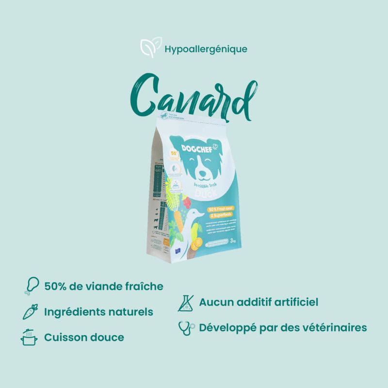 Cette recette au canard frais contient 50% de viande fraîche de canard élevé en plein air, une excellente source de protéines hautement digestibles, idéale pour les chiens sujets aux allergies.