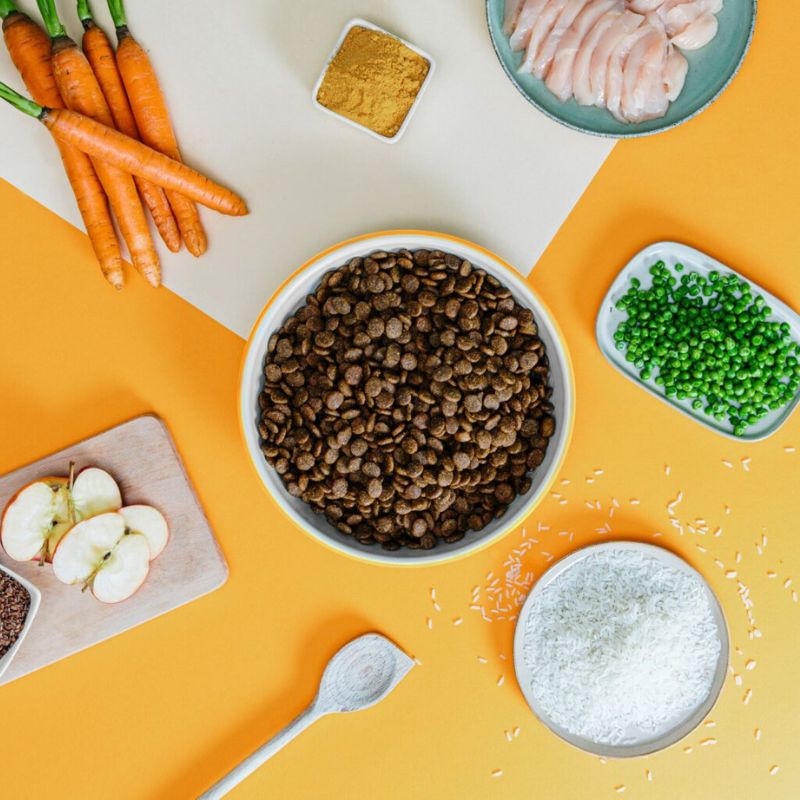 Poulet frais désossé 50%, viande de poulet séchée 13%, riz 10%, petits pois 10%, graisse de volaille 5%, carottes 2%, sels minéraux, fibres de betterave 1%, huile d’olive vierge, graines de lin moulues 0,5%, morceaux de pomme 0,5%, tégument de psyllium 0,5%, huile d’algues marines (source naturelle d’oméga-3 EPA et DHA) 0,3%, fructo-oligosaccharides (FOS), extrait de levure (source de mannan-oligosaccharides et bêta-glucanes), myrtille 0,01%, curcuma 0,01%, glucosamine HCl, chondroïtine sulfate.