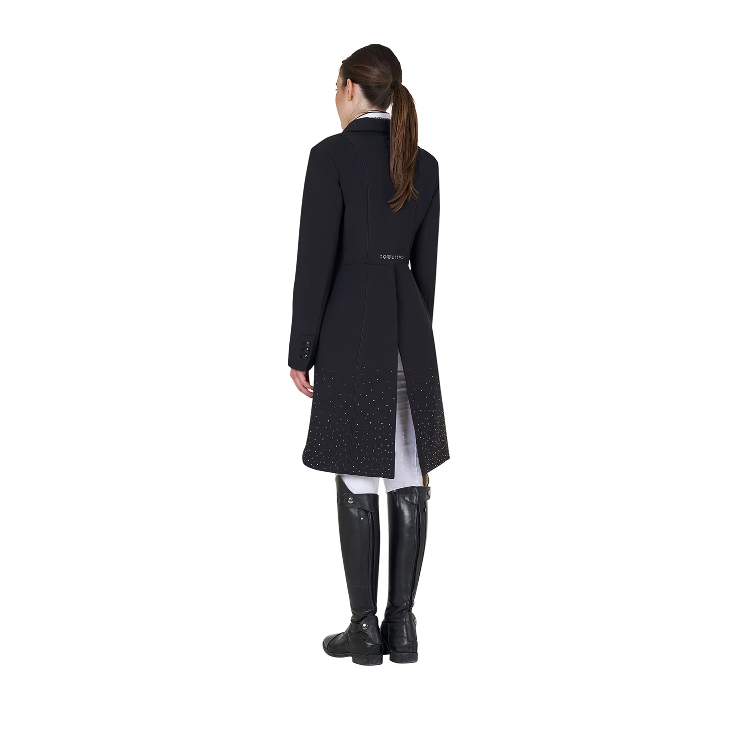 Ce modèle croisé, orné de six boutons pour une fermeture raffinée, est doté de poignets à trois boutons qui ajoutent une touche d’élégance. Les queues arrière sont dotées de lests amovibles, conçus pour offrir une stabilité maximale à chaque performance.
