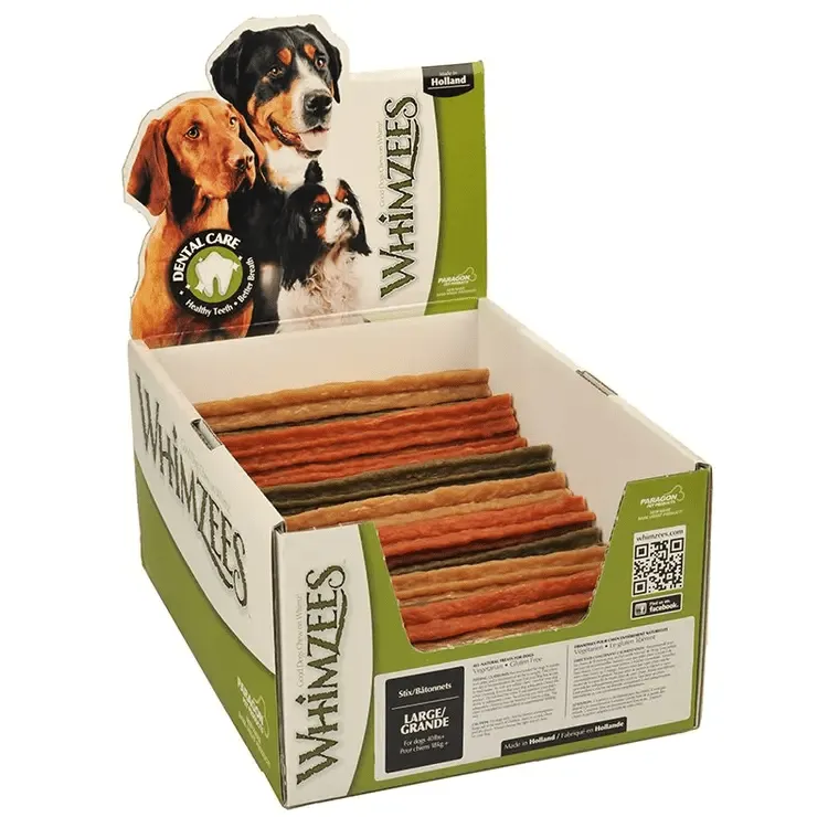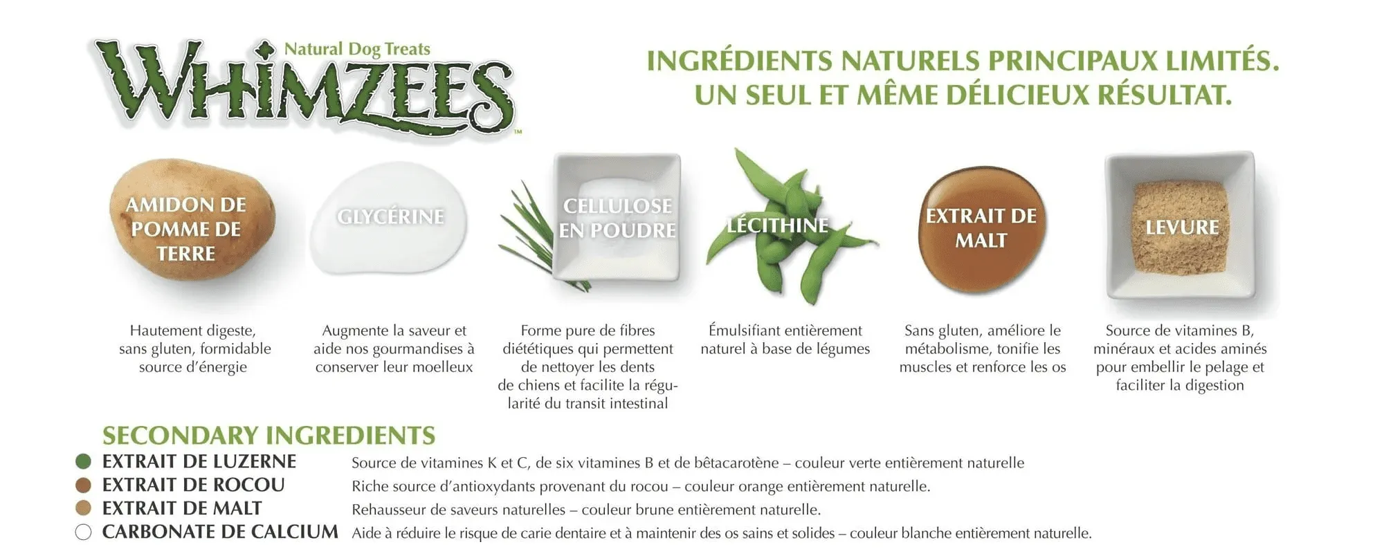 Gâterie dentaire pour chien Whimzee naturelle et végétarienne pour garantir à votre animal la meilleure qualité possible.