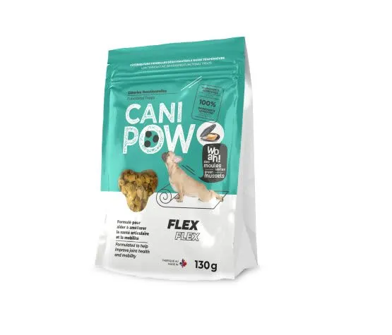 - Votre chien ne fera qu’une bouchée de CaniPow Flex, un gâterie saine à base d’ingrédients déshydratés à basse température comme : le porc, le curcuma, les graines de lin, la moule verte et un mélange d’extraits de plantes soigneusement formulé pour aider à améliorer sa santé articulaire et sa mobilité.