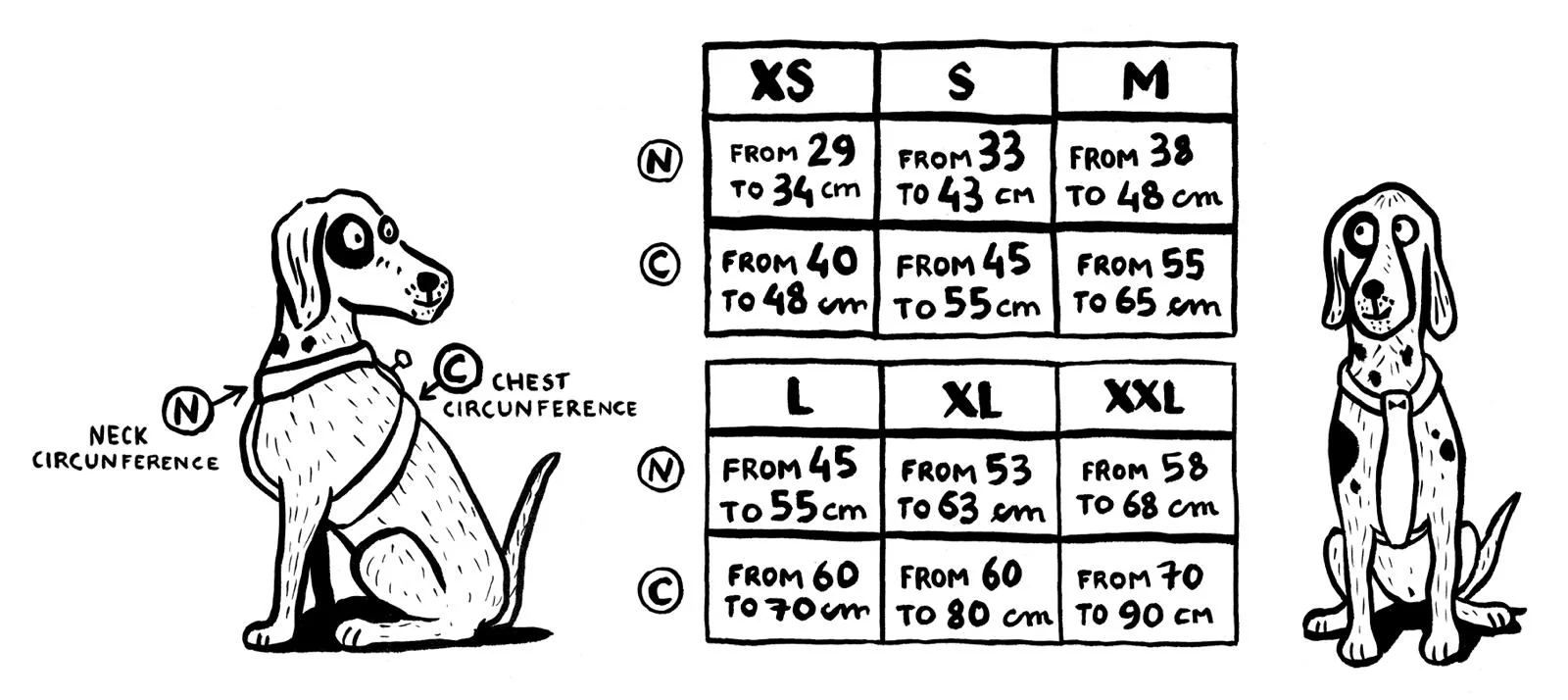 Nous vous conseillons de mesurer votre chien avant toute commande. Voici notre tableau des tailles :