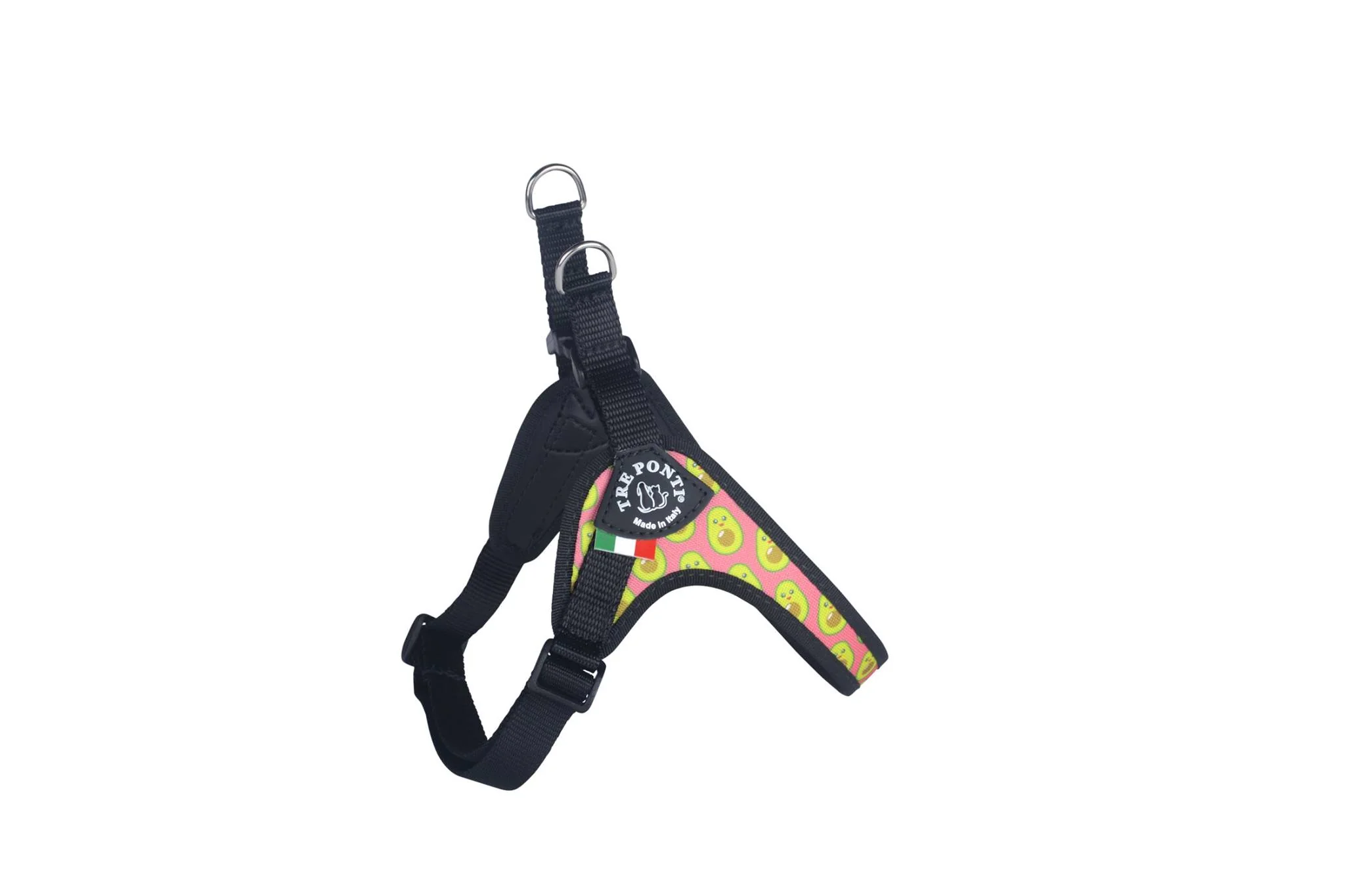 Harnais classique réglable, fermeture boucle plastique, à bords noirs et motifs imprimés aux ambiances estivales !