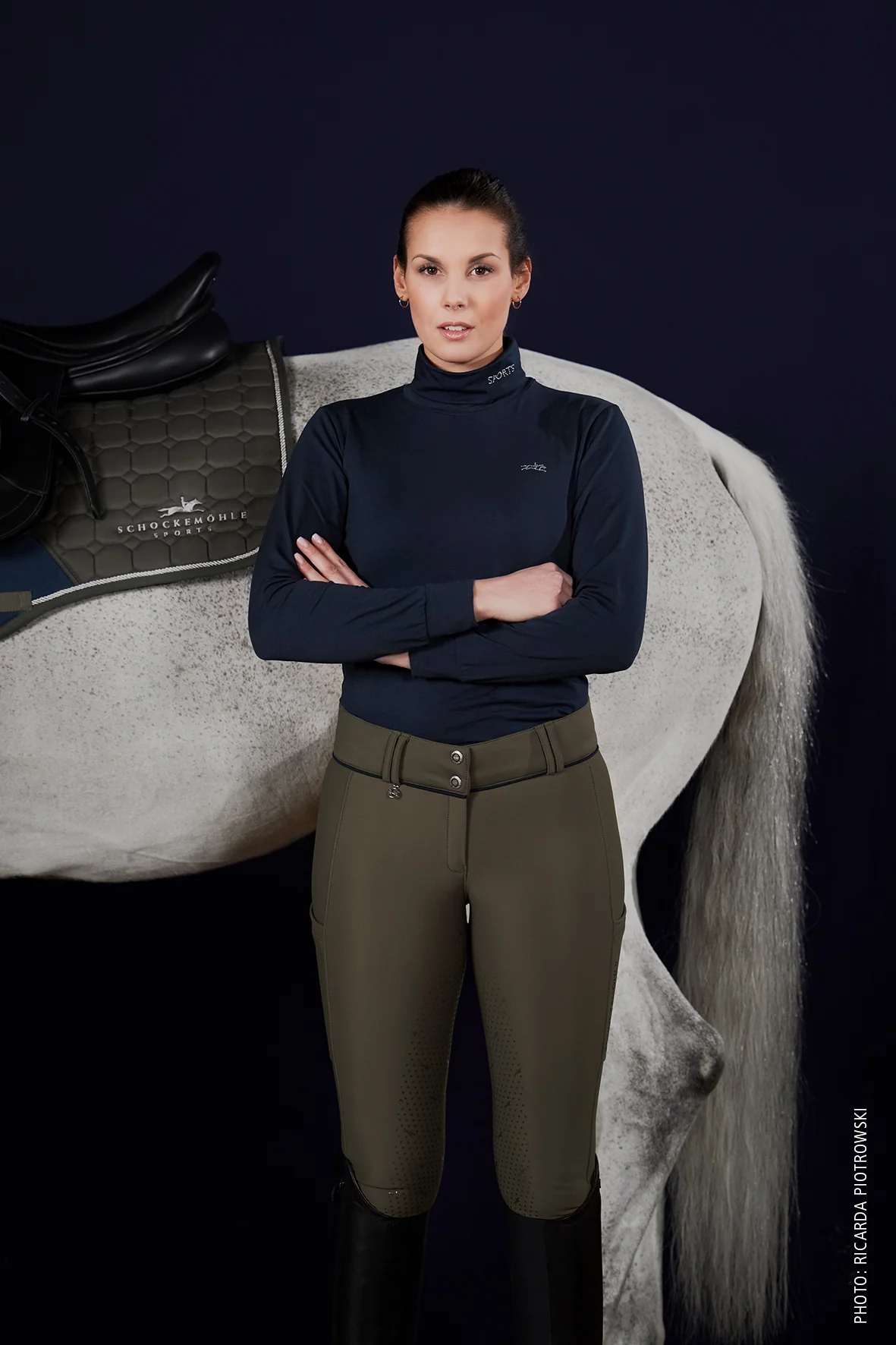Couleurs hivernales discrètes, coupe confortable grâce à l’élasticité nécessaire : le t-shirt à col roulé Amber Style de Schockemöhle Sports est un bon choix pour chaque journée plus froide. Il est respirant et du plus bel effet avec son motif strass sur le col et la poitrine !