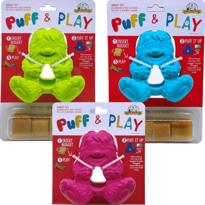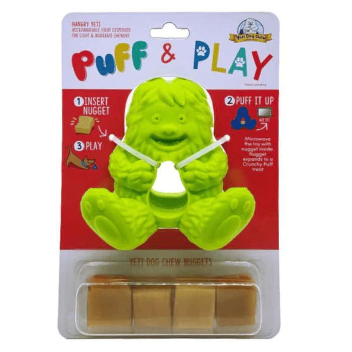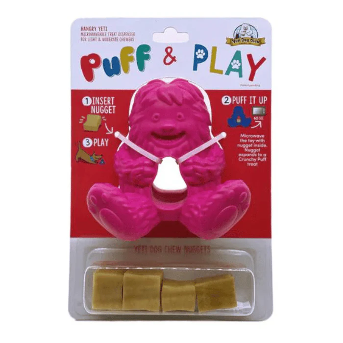 Le jouet Yeti Puff and Play est un jouet distributeur de friandises à mâcher de longues durées pour les mâcheurs légers et modérés. Il existe en trois couleurs différentes : Rose, Vert et Bleu. Il va au micro-ondes et au lave-vaisselle et fonctionne bien avec les pépites Yeti entièrement naturelles.