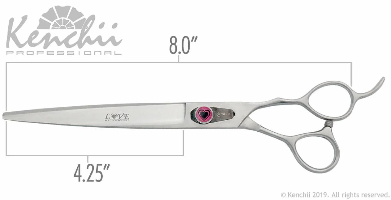 Les ciseaux de toilettage Kenchii sont les plus performants du marché ! Acier allié japonais entièrement forgé et aiguisé à la main, avec bord semi-convexe microdenté antidérapant personnalisé. Les modèles Love sont fabriqués avec des poignées décalées pour le confort et finis avec du satin antirouille.