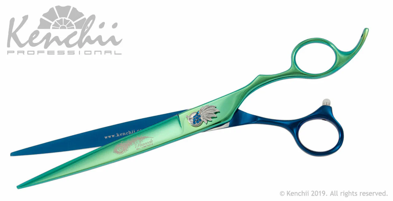 La cisaille Kenchii Peacock™ coupe sans effort les pelages les plus grossiers. Les bords semi-convexes conviennent au toilettage quotidien ou aux travaux de finition et l’alliage de niveau 3 assure un tranchant durable. La Peacock™ est dotée d’une finition en titane duotone bleu et bleu-vert et de marquages personnalisés sur le capuchon et la lame de l’assemblage du paon.