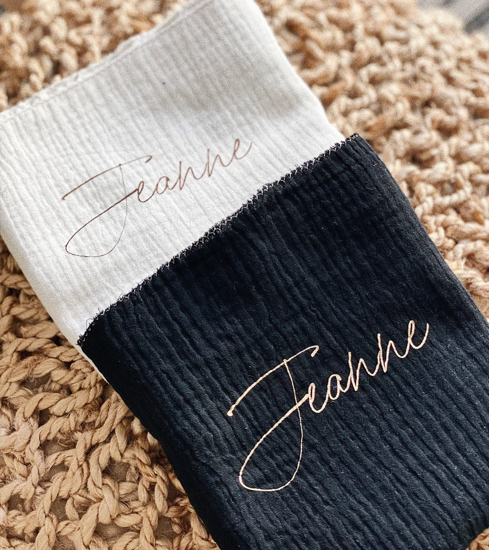 Nouveau lange noir avec écriture manuscrite doré à personnaliser avec le prénom ou le surnom du bébé.