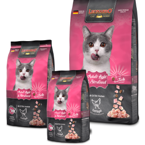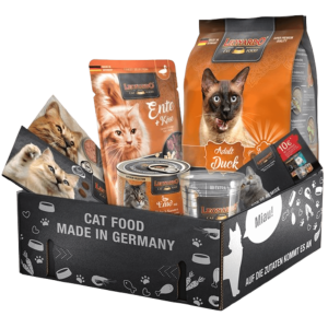 Truite + Cataire : truite (30 %); coeur et foie de poulet (30 %); bouillon de truite, poulet, boeuf (28,7 %); poumon de boeuf (10 %); coquilles d’œufs séchées (0,5 %); substances minérales (0,5 %); huile de saumon (0,2 %); cataire (0,1 %)