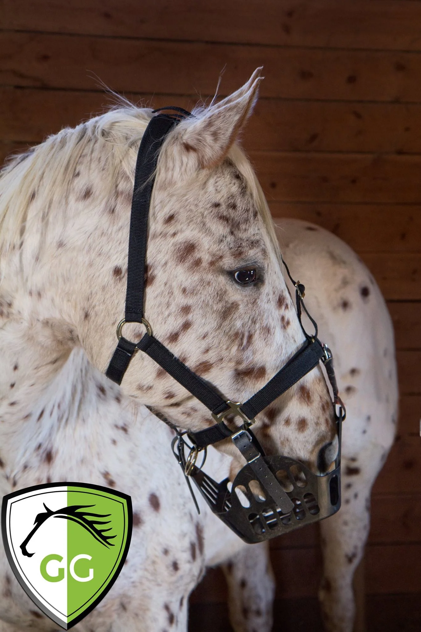 Le licol Greenguard a été spécialement conçu pour être utilisé avec le panier Greenguard. Il dispose d’une muserolle rembourrée pour le confort. Boucle de fixation pour un ajustement parfait. Mousqueton sous-gorge pour la libération rapide. Sangle additionnelle qui se place sur le devant du visage pour empêcher le licol de bouger. Logo Greenguard sur le côté. Fixations métalliques. Ce licol est une aide précieuse pour aider à prévenir la fourbure.