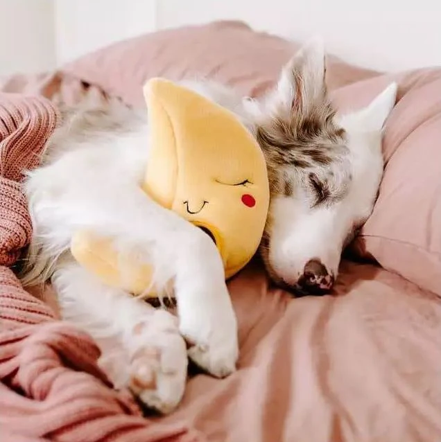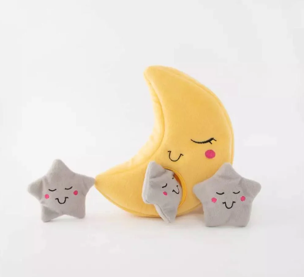 Jouet interactif, composé d’une grande lune et de 3 petites peluches étoiles avec un squeaker.