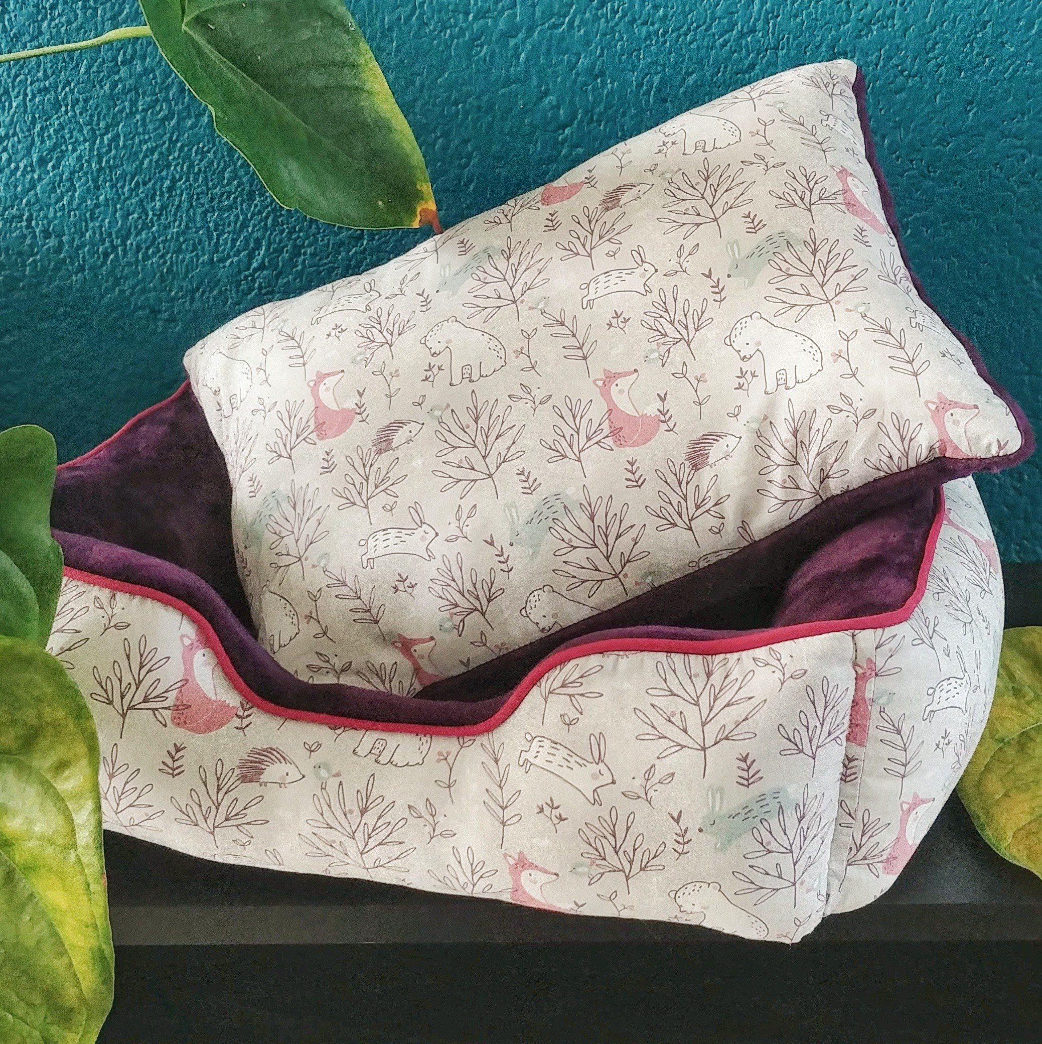 - 100% cotton purple, lavender, brick, white and mint printed outside fabric