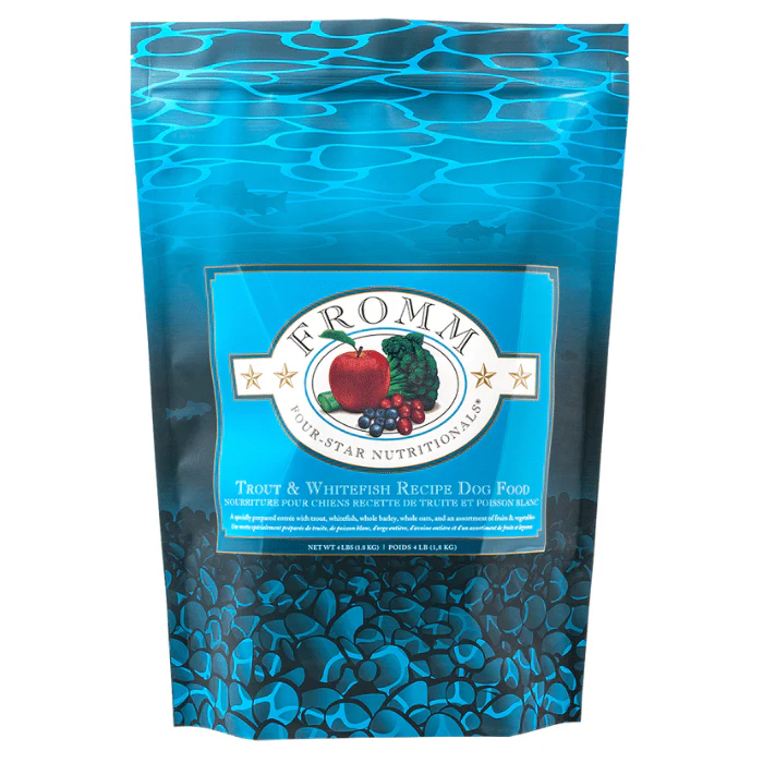 Truite, poisson blanc, farine de saumon, produit d’œuf séché, farine de poisson menhaden, orge entière, avoine entière, riz brun, farine d’avoine, orge perlé, foie de porc, graisse de porc (conservée avec des tocophérols mixtes), pulpe de tomate séchée, huile de saumon (conservée avec des tocophérols mixtes), levure de brasserie séchée, herbe de miscanthus, graines de lin, brocoli, pommes, vitamines, extrait de racine de chicorée, minéraux, sel, canneberges, sélénite de sodium, extrait de Yucca Schidigera, acide sorbique (conservateur), taurine, bleuets, probiotiques.