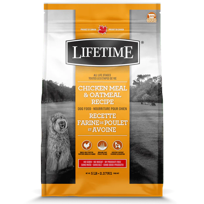 LIFETIME® Poulet et Avoine pour toutes les étapes de vie est une recette à protéine unique de viande qui fournit une alimentation complète et équilibrée pour votre chien, de chiot au stade adulte, en utilisant des ingrédients de haute qualité, SANS maïs, blé, soja, gluten ou sous-produits.