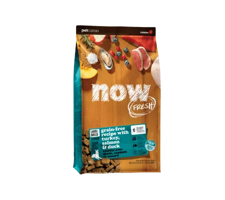 Composée à 100% de dinde fraîche, de saumon, de canard et de 100% huiles riches en Oméga 3&6 issues de la noix de coco, la nourriture pour chien senior de race Now Fresh ne contient pas de gluten, de blé, de maïs, de soja ou de boeuf.