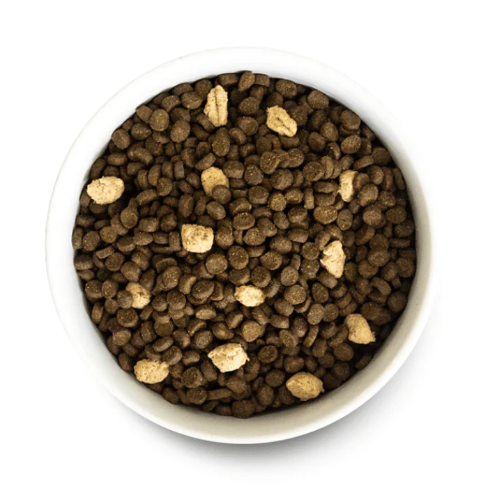 Croquettes recouvertes d’une garniture crue et de bouillon d’os avec des morceaux crus lyophilisés, fabriques à partir d’un mélange poisson blanc, saumon et sébaste sauvage. Sans grains.
