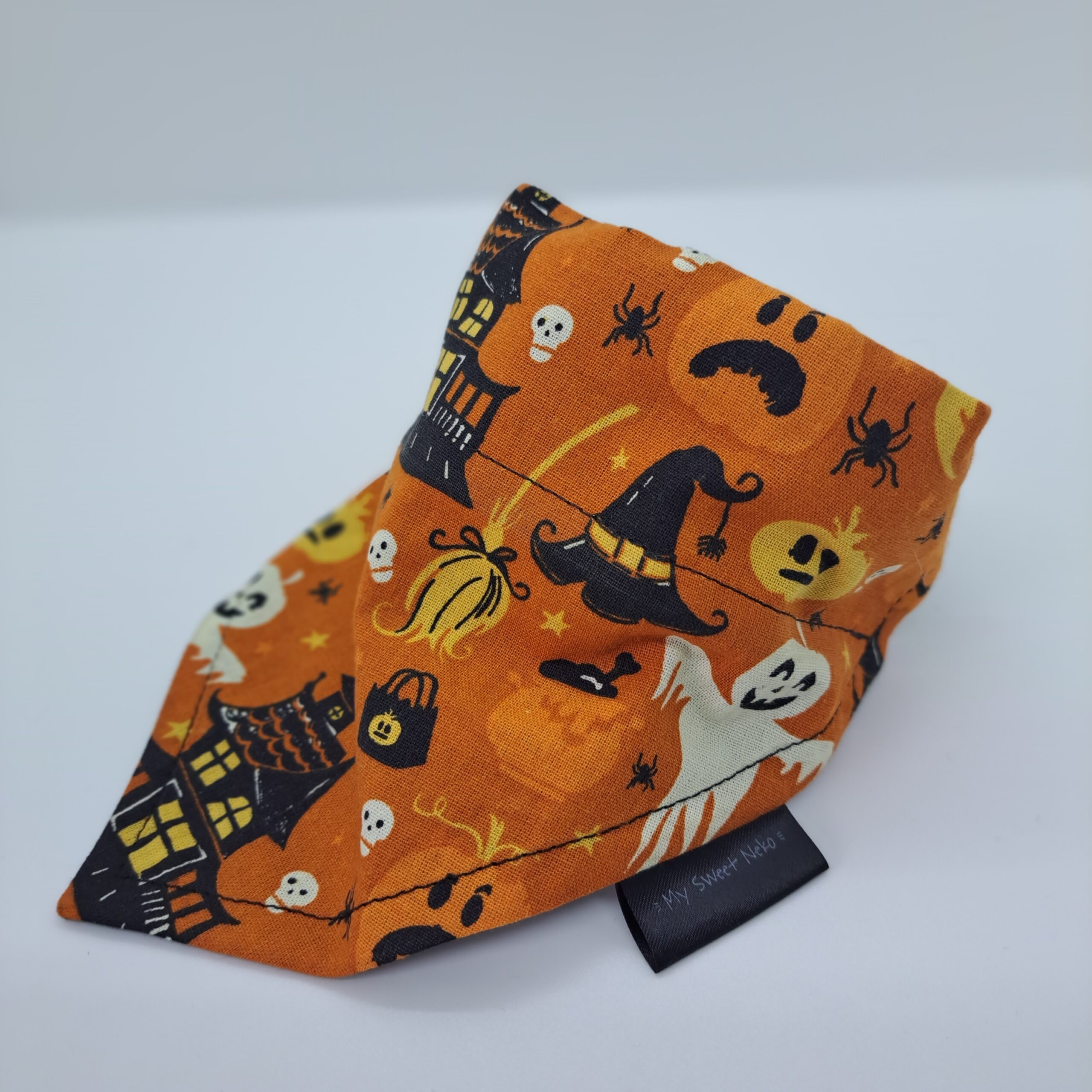 - Design: Set against a bright orange background, the bandana is adorned with iconic Halloween motifs such as a haunted mansion, smiling pumpkins, prankish ghosts, and spooky spiders. Your pets will blend perfectly into the Halloween atmosphere.