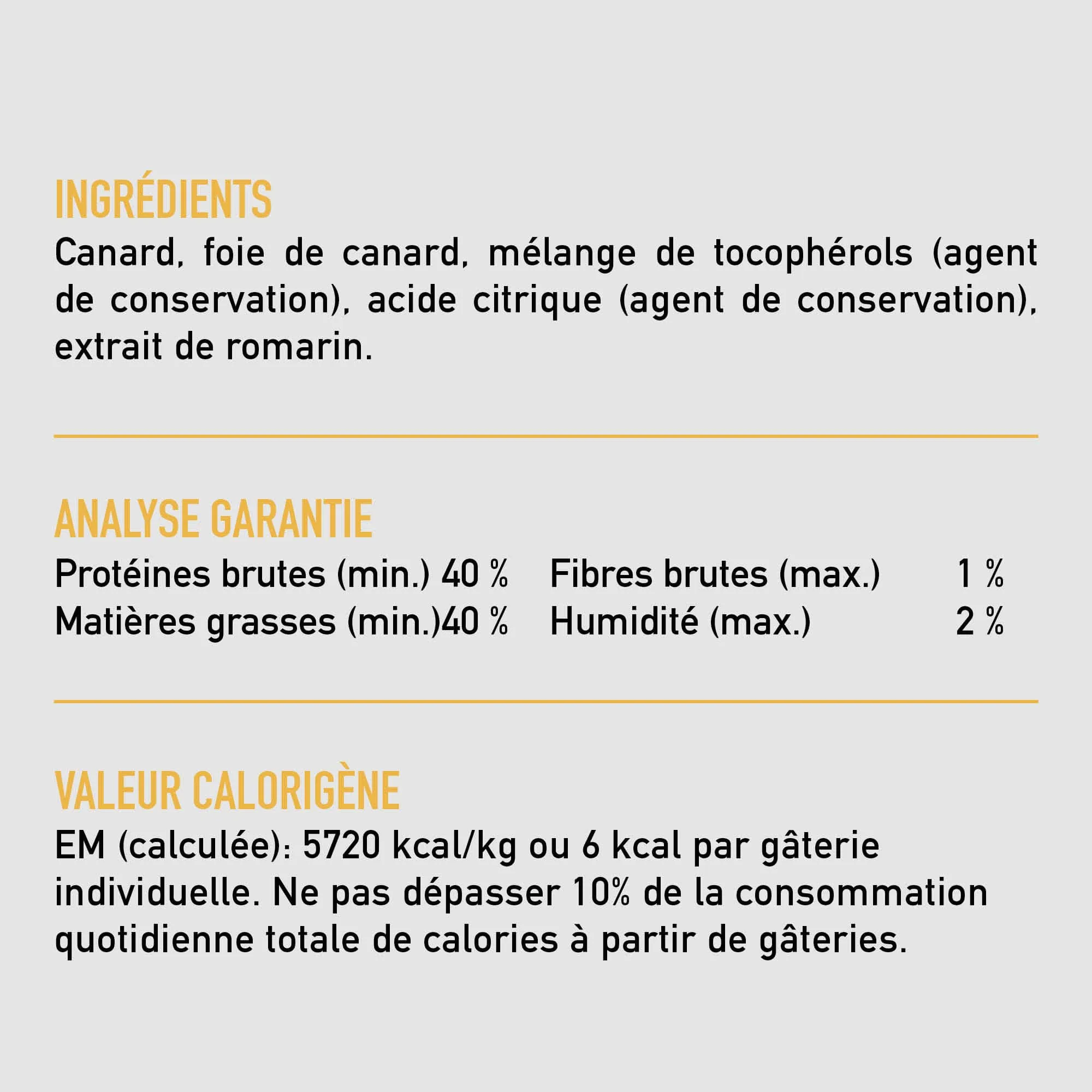 Adaptées aux besoins physiologiques de votre chien, nos gâteries à source unique ORIJEN constituent un moyen simple de nourrir et de récompenser votre animal avec des aliments naturels dont il raffolera. Regorgeant de saveurs naturelles, cette gâterie unique est composée de canard élévé en liberté 100 % pur et naturel dans des proportions correspondant à ce que l’on trouve dans les proies entières, cela dans le but de garder votre chien adoré heureux, sain et fort.