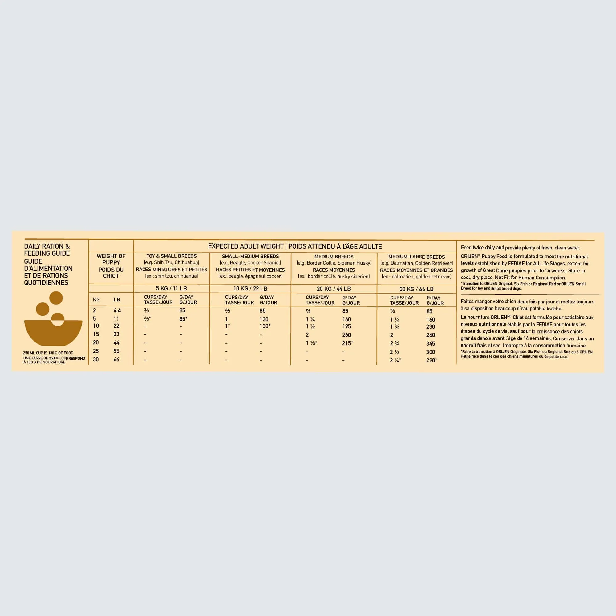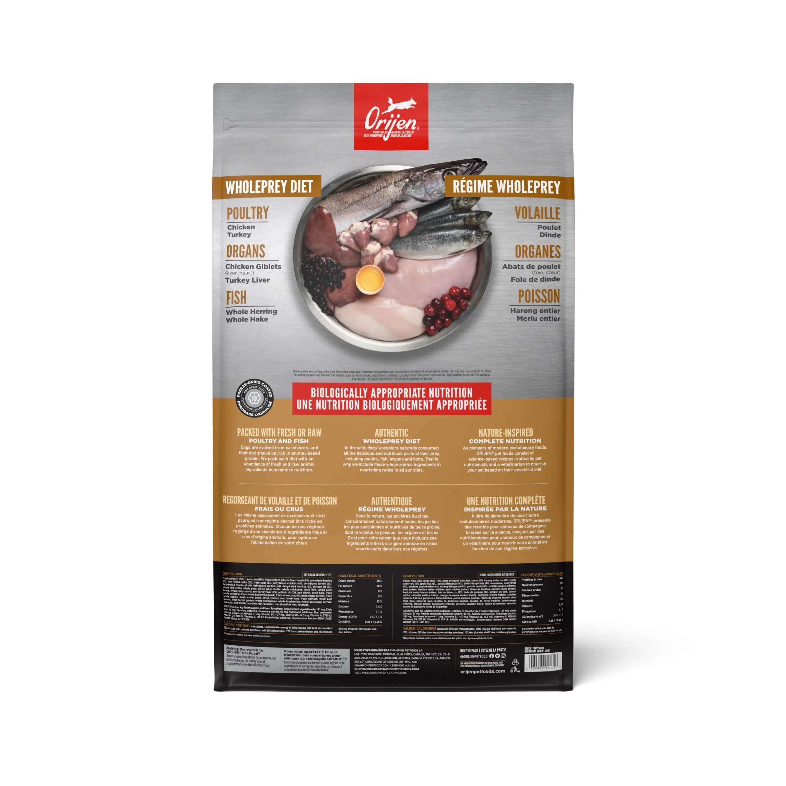 À l’image du régime naturel de votre chiot, ORIJEN PUPPY contient un mélange sain et varié de viandes, de fruits, de légumes et d’herbes, idéal pour la croissance des chiots et jeunes chiens. Produit du Canada