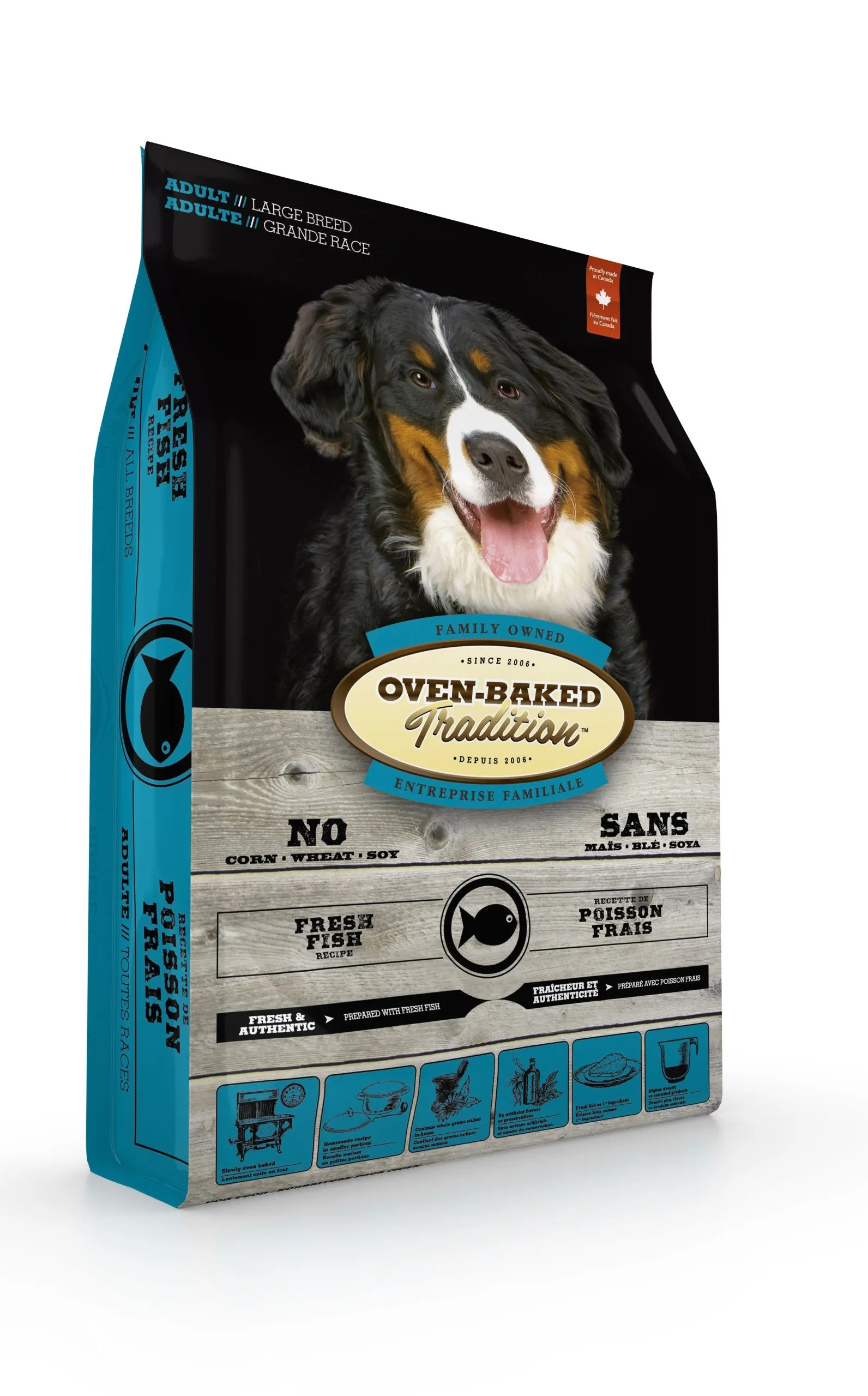 - Notre nourriture pour chien adulte de grande race est préparée avec du poisson frais comme premier ingrédient, des fruits et des légumes soigneusement choisis, et des grains entiers moulus maison comme de l’orge mondé ou du seigle.