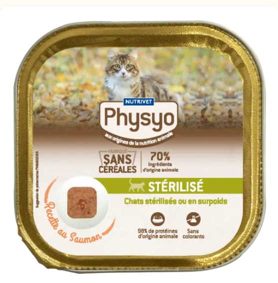 Viandes et sous-produits animaux 62 %, poissons et sous-produits de poissons (8 % dont saumon 4 %), légumes (carottes 2 %, tomates déshydratées 0,7 %, équivalent à 3,5 % de tomates), sous-produits d’origine végétale (inuline de chicorée 0,4 %), substances minérales.