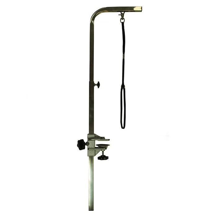 Ce poteau de tonte comporte une pince qui convient aux tables de toilettage standard. Lié à une loupe, il permet de faciliter le toilettage. Il est fait d’acier inoxydable. Sa hauteur s’ajuste de 24 » à 44 » afin d’accommoder les animaux de toutes tailles. Grâce à une section qu’on peut rajouter ou enlever au besoin, il peut être utilisé de deux façons, selon la grosseur de l’animal sur lequel on travail