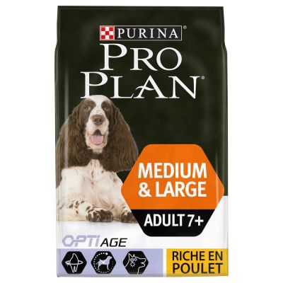 PURINA PRO PLAN Medium & Large Adult 7+ avec OPTIAGE est une alimentation complète qui comprend une combinaison de nutriments prouvés pour aider à améliorer les fonctions cérébrales des chiens matures, préserver leur niveau d’activité et leur vivacité.