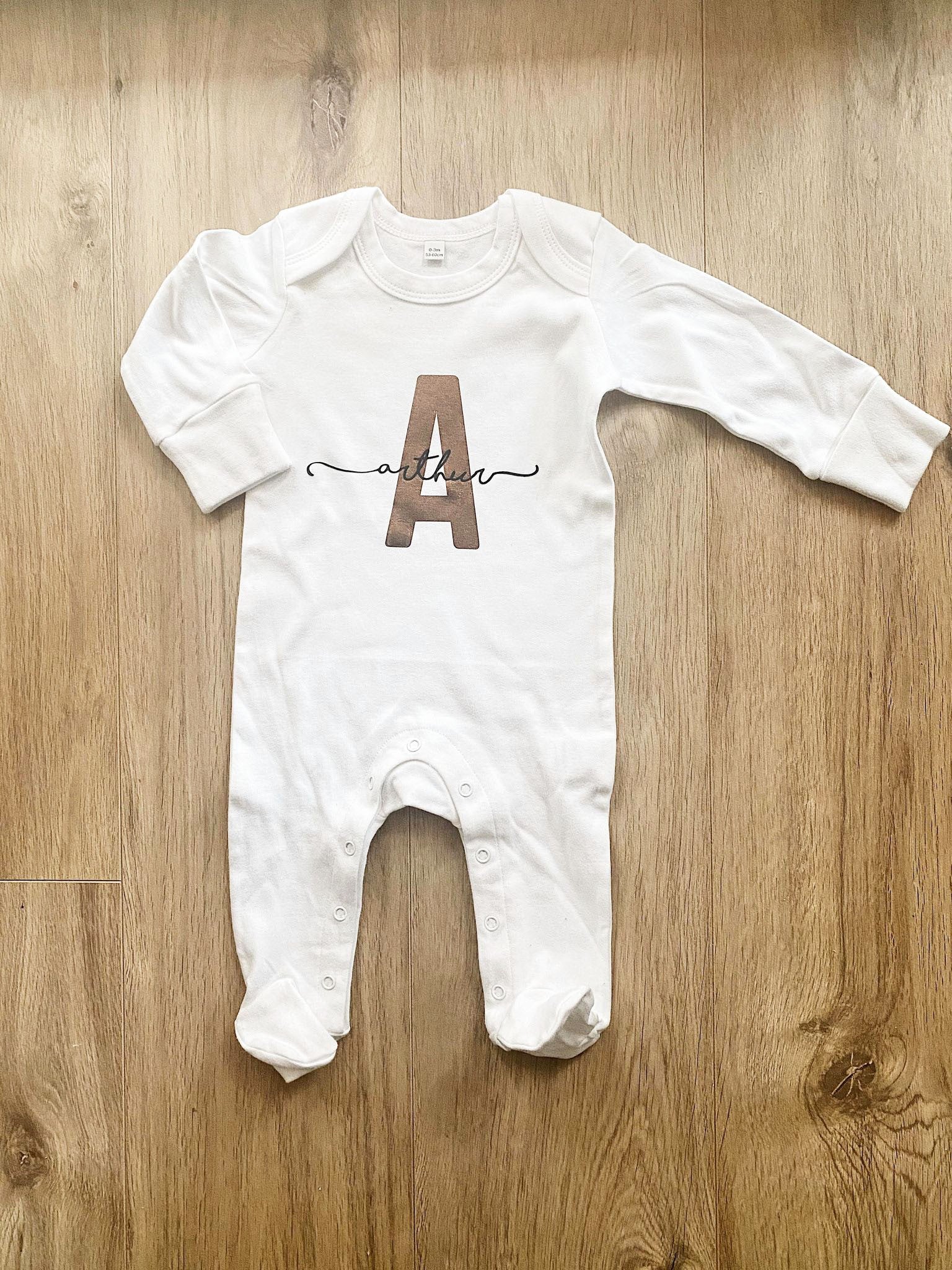 Ce pyjama en coton biologique est personnalisable avec le prénom ou le surnom du bébé. L’initiale est de couleur bronze et le prénom en velours Oeko-tex.