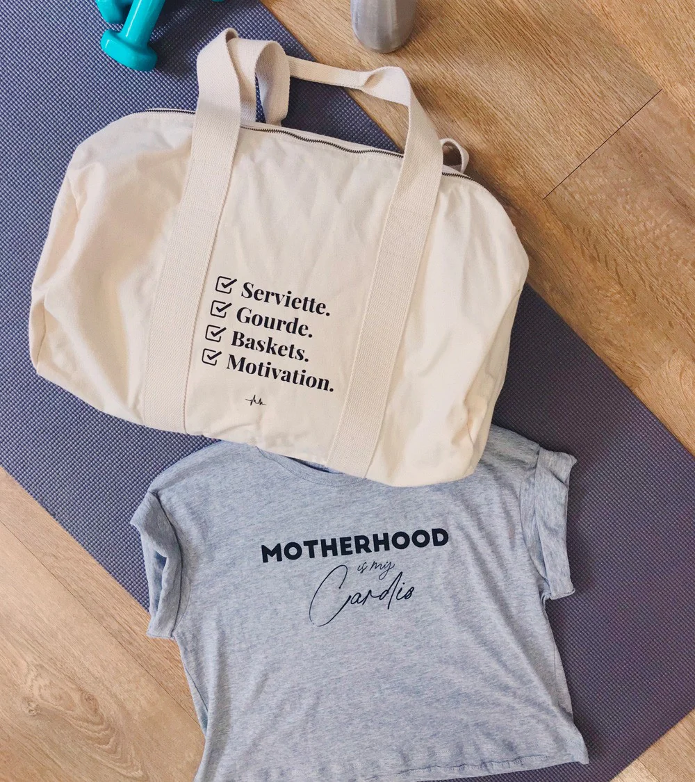 Un cadeau parfait avec un Crop top hyper doux et confortable « Motherhood is my Cardio », associé à un sac au design créée exclusivement par Caroline (www.fitmumfrance.fr) le tout en coton biologique bien sûr.